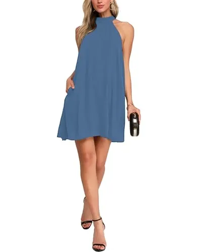 - Features: Summer dresses with halter neck design show off your neckline perfectly. Sleeveless, off shoulder, back keyhole with buttons, two pockets, A-line, casual style,Flowy swing dress. Classic sundresses for women will never goes out of style.