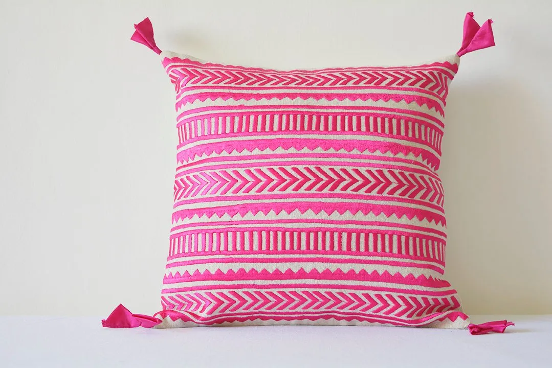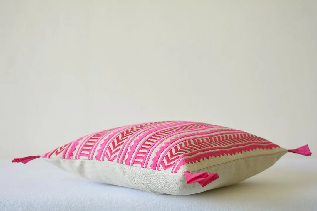 Graphic Pink Geometric Embroidery on Natural Ecru Cotton Linen base cushion. This pillow is perfect to add a monochrome vibe to your modern home. Little bunting corner detail makes this a fun and playful pillow, perfect for your children's bedrooms and play area!