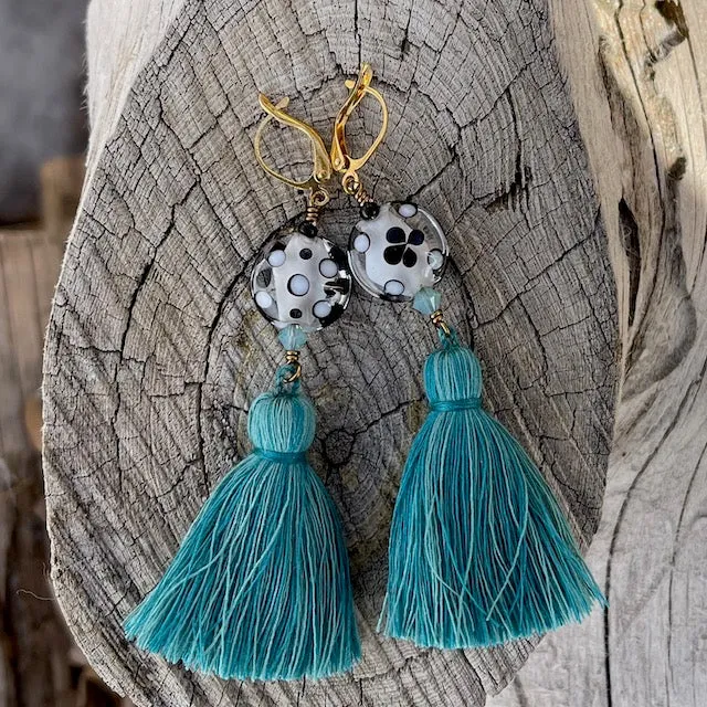 Choose your color! These fabulous tassel earring are sure to become your everyday faves! The tassels are made of cotton thread and I've combined them with striking crystals, handcrafted glass beads and silver double basket beads. Black, purple and white options have sterling silver ear wires and turquoise has gold-filled ear wires.
