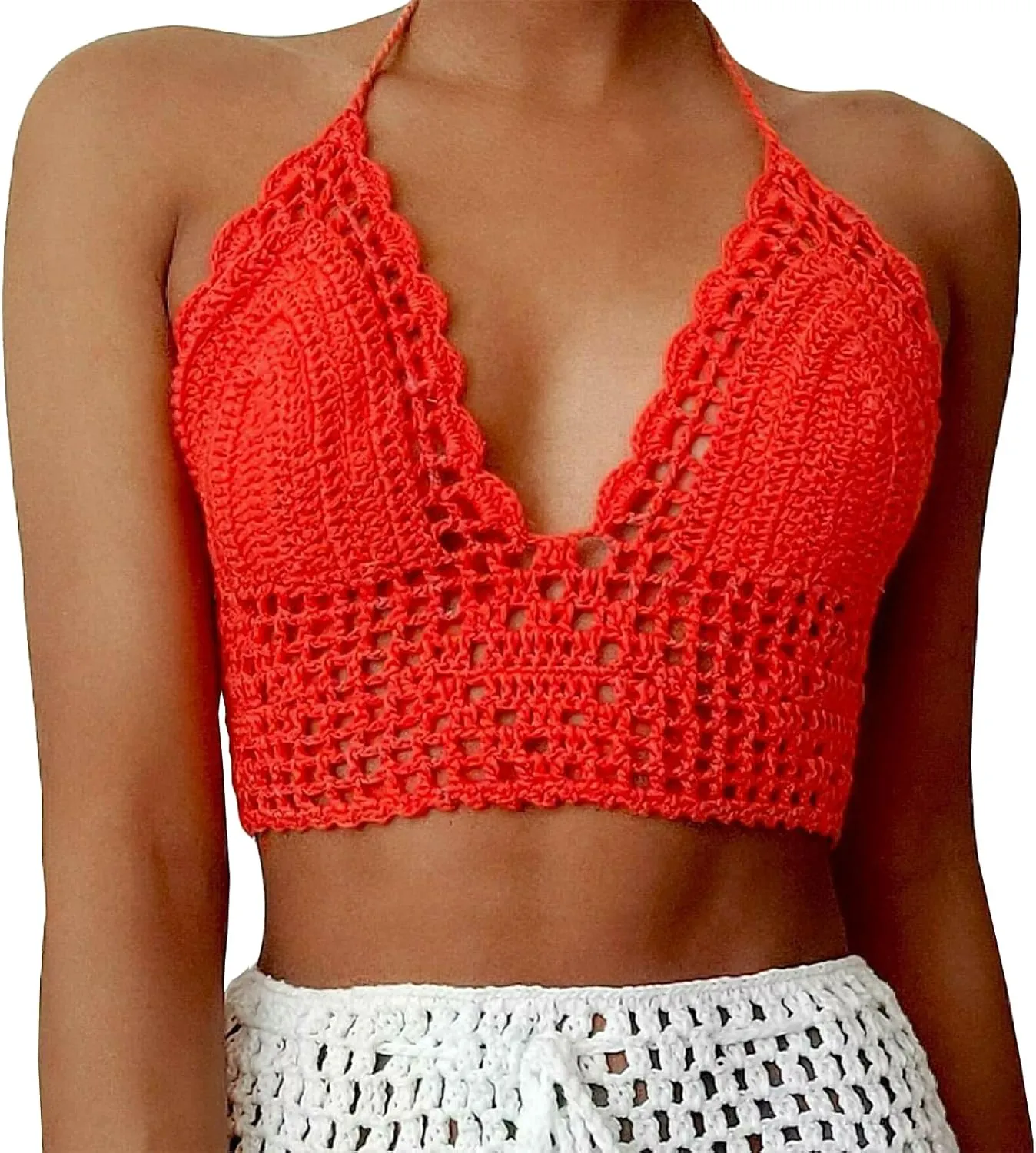 • Halter V Neck Backless Crochet Knit Cami Crop Tops Bohemian Beach Bra Bikini with Tie Up Back