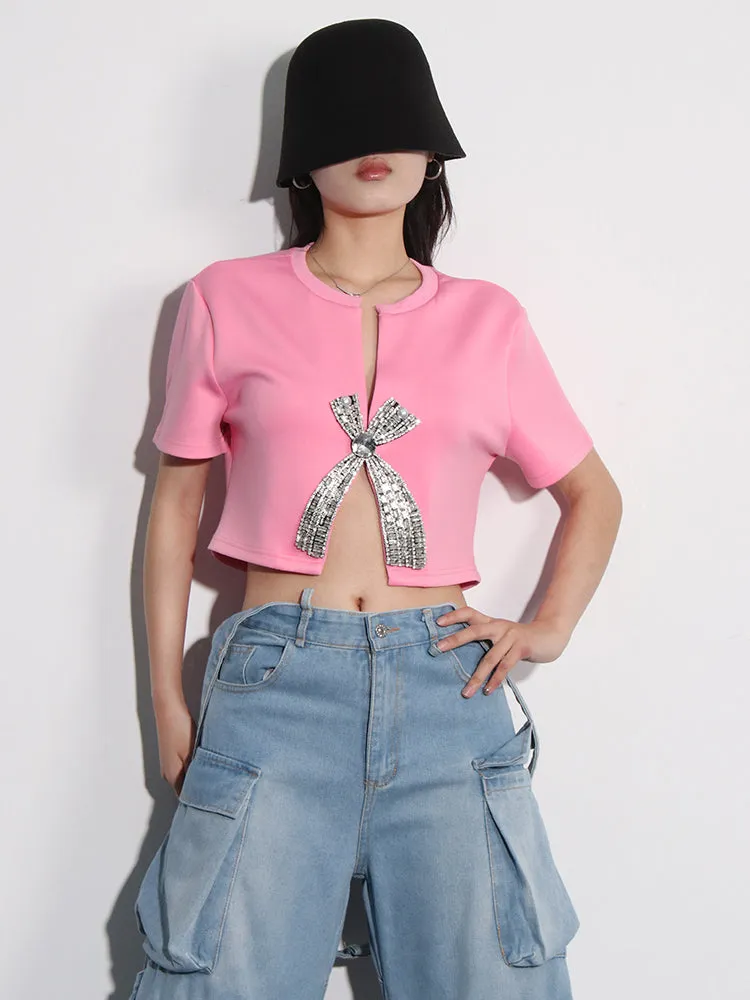 This high-quality Diamond Bow Crop Top features an embellished bow with a pearl and a stylish cut in the front. Perfect for pairing with a variety of bottoms from our collection or jeans, this crop top adds a touch of elegance to any outfit.