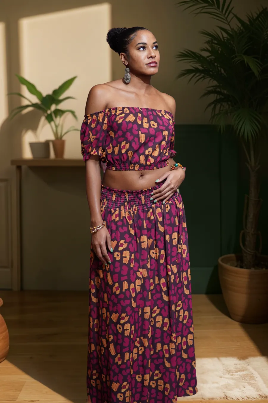 Nina Cheyenne Exclusive Design: The Eva skirt set is an ethnic abstract print, in shades of purple and gold, make this set an eclectic option for any occasion, while a fun two-piece design allows you unlimited options for mixing and matching. Set includes a breezy, smocked waist maxi skirt, with abstract print, and a matching off the shoulder smocked crop top.