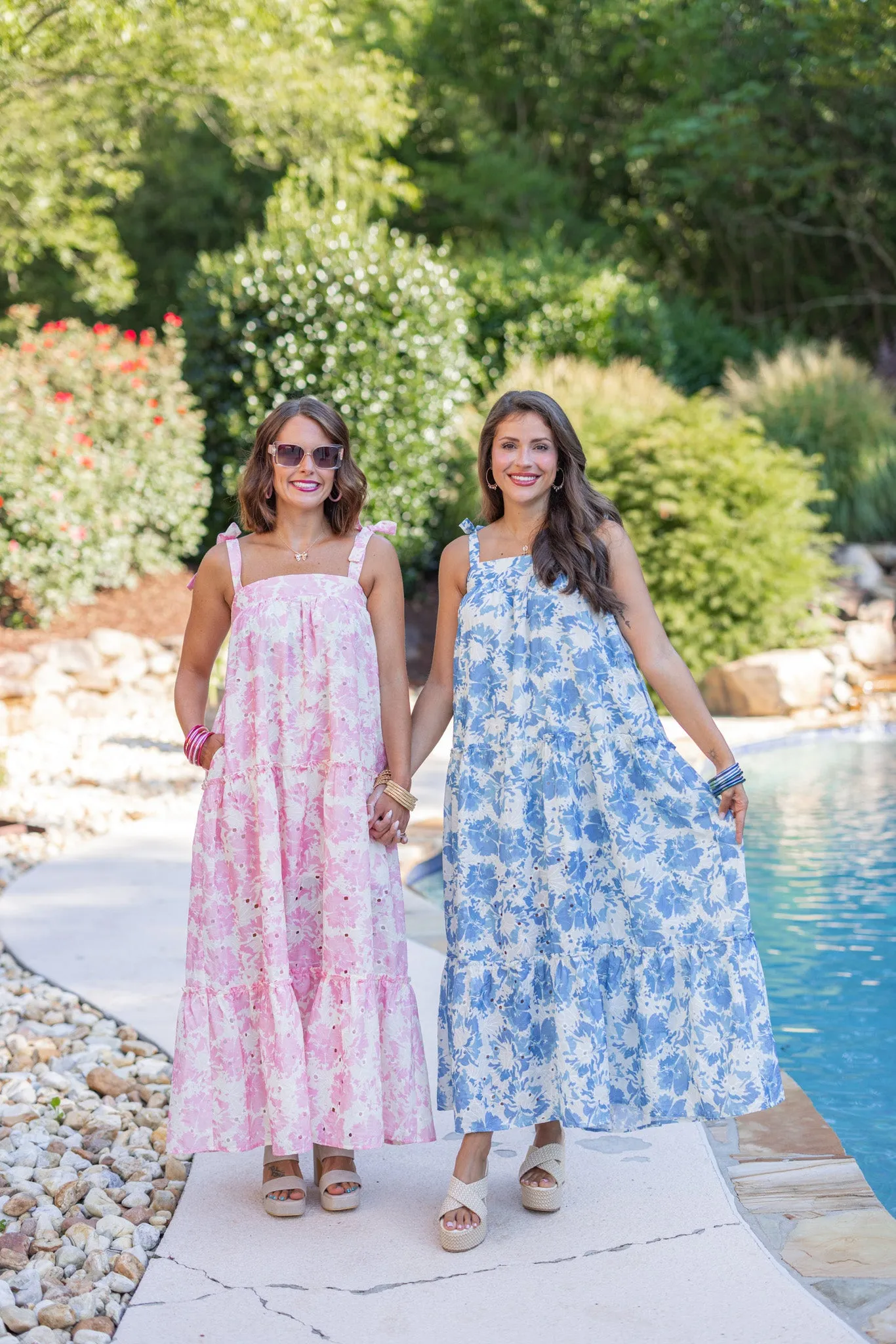 Ladies, check out this fabulous ruffle tiered dress! She steals the show with her blue and cream floral print fabric accented with embroidered floral eyelet details. Featuring a square neckline with self tie shoulder straps, and ruffle tiered layers with a ruffled bottom hem. She's also bump friendly and would make a darling baby shower dress!