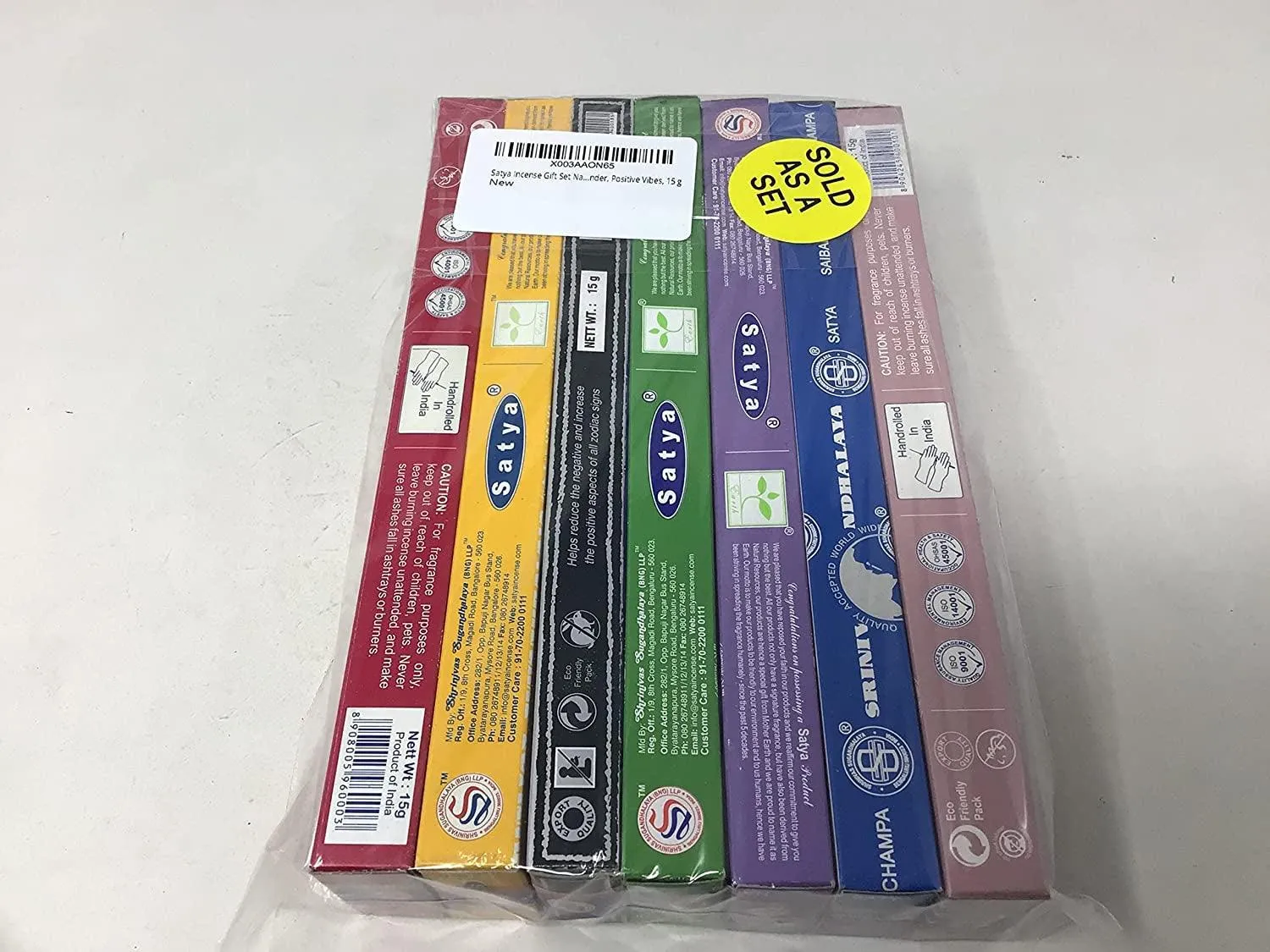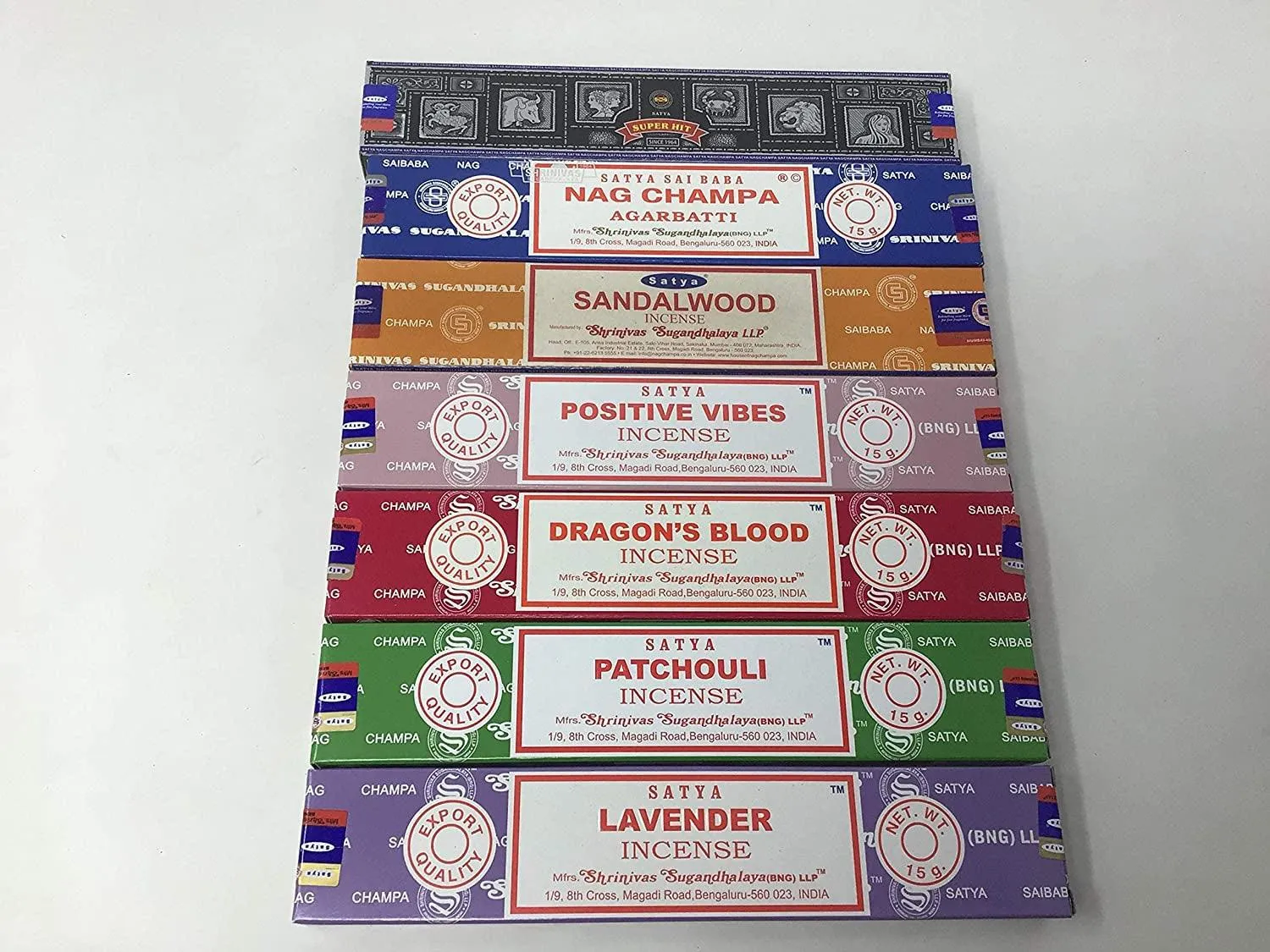 - Pack of 7 Boxes (15 gm each) Satya Nag Champa, Super hit, Dragon's Blood, Sandalwood, Patchouli, Lavender & Positve Vibes Incense Sticks.