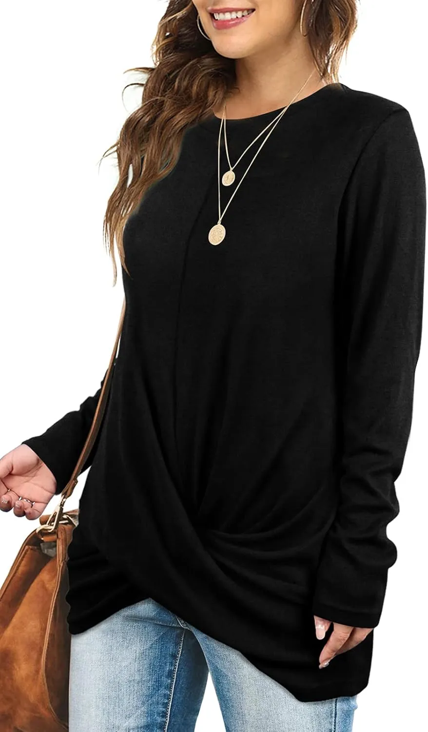 • FeaturesCrew neck, Long sleeve, loose fit style is casual and basic as daily wear or work wear, and it is all-matching! Twist front design will make you more stylish and charming! The lenghth of this ladies tops is perfect, it is long enough to cover your hips as tunic tops for leggings for women.
