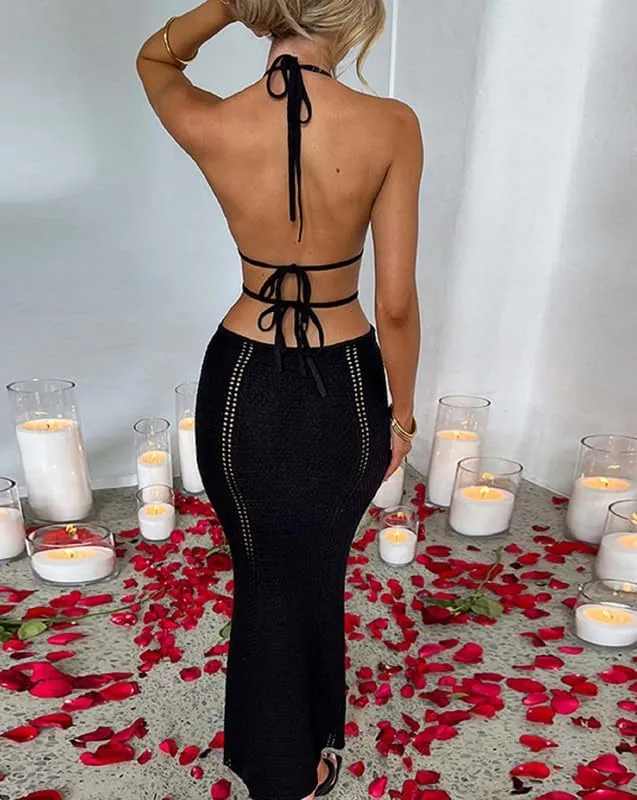 Women Sleeveless Crochet Knit Maxi Dress Slim Fit Hollow Out Backless Long Dress Sexy Deep V Neck Bodycon Sundress