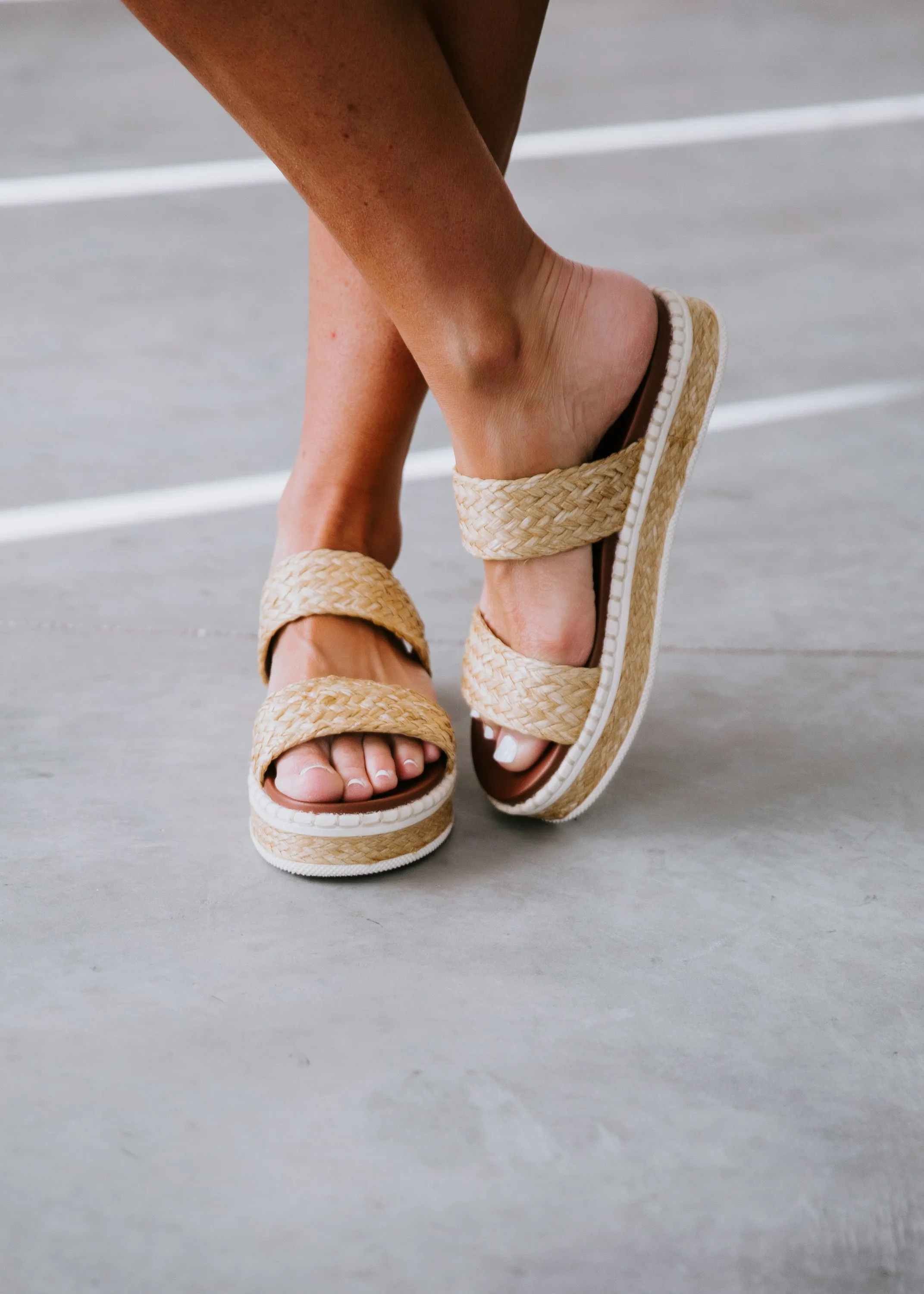 Crafted with woven raffia detailing and a contoured footbed, these slip-on sandals offer both comfort and style. The double strap design adds a touch of elegance, while the platform provides extra support.