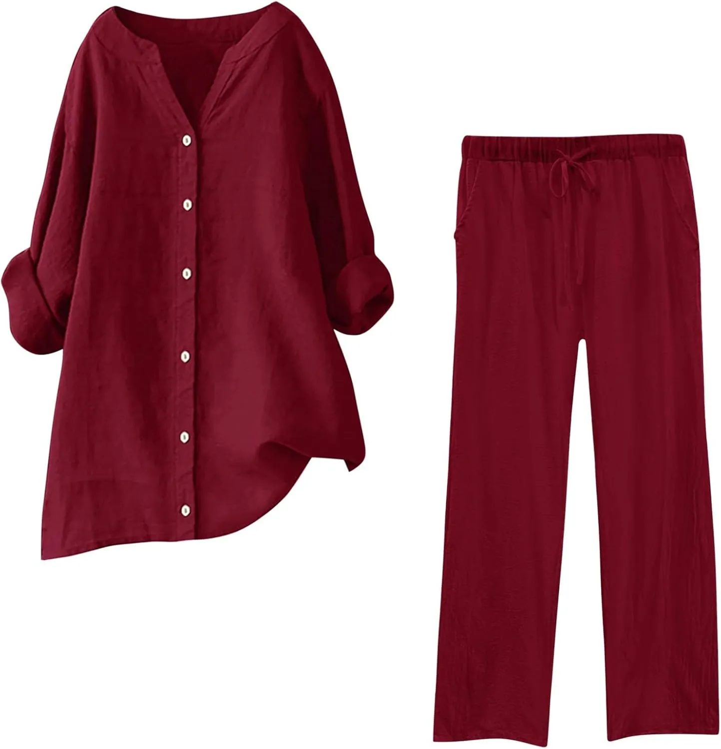 Linen Sets for Women 2 Piece Outfits Summer Button Down Shirt Wide Leg Casual Pants Solid Color Plus Size Tracksuit