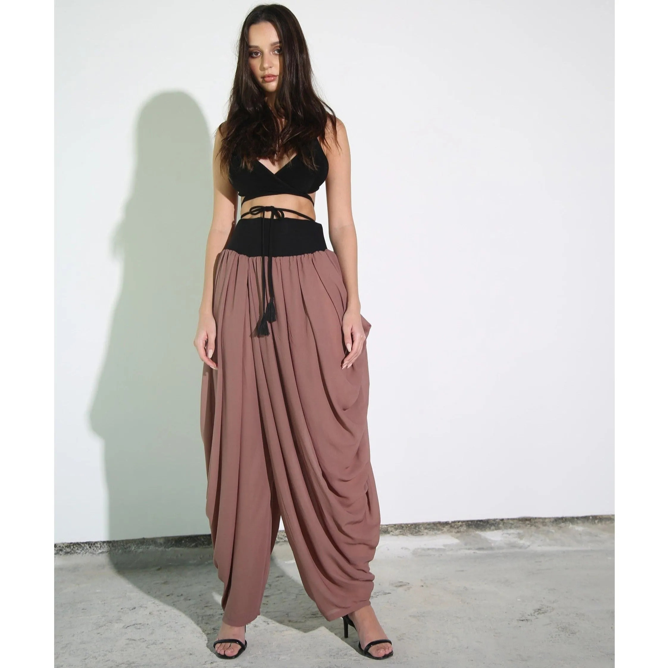 These mocha sheer draped pants are crafted with a weightless flowy ultra soft chiffon fabric. This draped chiffon pant is semi sheer and comes with an elasticated waistband that is Ultra stretchy and helps sculpt the tummy in a subtle way providing ultimate comfort.