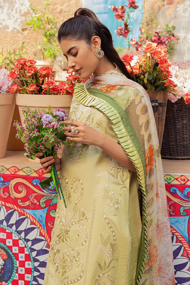 Fabric: Sofia: ""Shades of green, a perfect springtime scene. This Chikan sequin shirt with crochet lace details and a digital print chiffon dupatta is the perfect combination of elegance and comfort."" Chikan sequin embroidered lawn front Chikan sequin embroidered lawn back Sequin embroidered lawn sleeves Chikan sequin embroidered front and back border Crochet lace for sides slits Crochet lace for neckline Crochet lace for sleeves Digital print chiffon dupatta Dyed cotton trouser |
