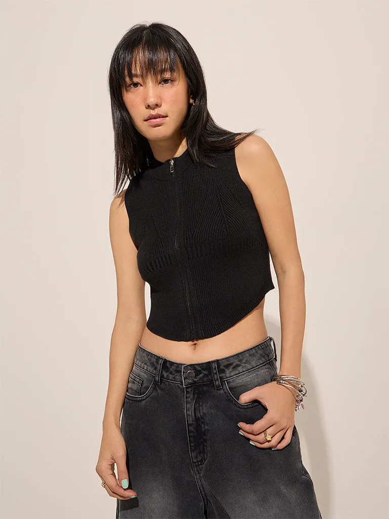 This black top by Nuon is woven from a ribbed textured fabric with a zipper placket. It has a high neck and a sleeveless cut, keeping it casual and stylish.
