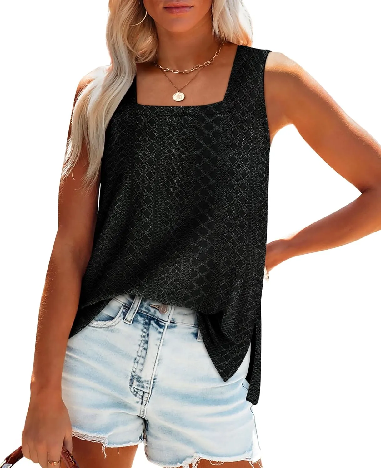 • Material: This solid color square neck tank top is made of 95%Polyester,5%Spandex.eyelet embroidery tank tops .Loose, comfortable,soft, lightweight, breathable, light-stretch, wrinkle-free and skin-friendly.