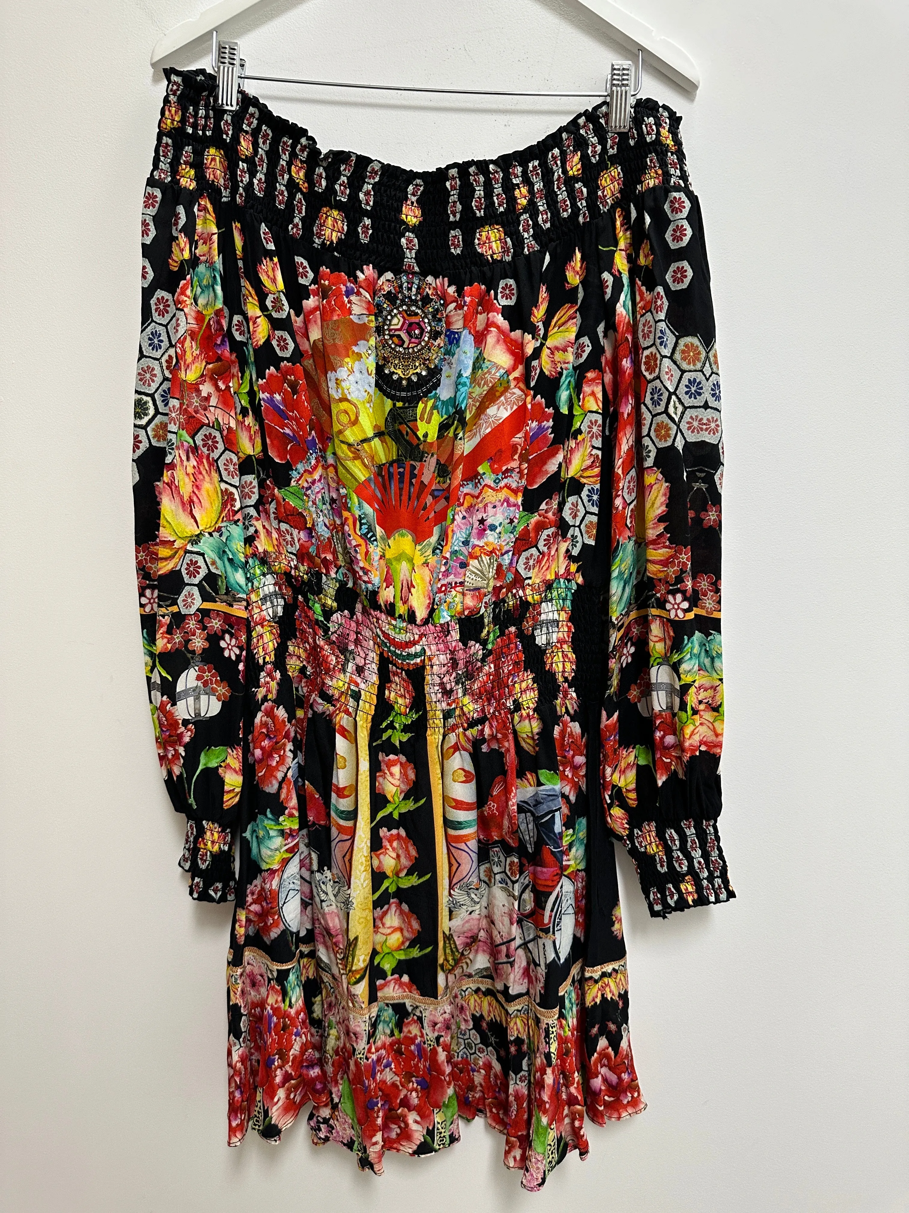 Stepping into a world of profound authenticity, the Off-Shoulder Short Dress in Painted Land pays homage to the captivating allure of Japan through a mesmerizing hand-painted print. Crafted from luxurious silk embellished with traditional rickshaws and exotic floral blooms, this enchanting off-the-shoulder dress showcases a shirred button-front neckline, a front adorned with crystals, and a generously frilled hem, embodying an aura of feminine grace.