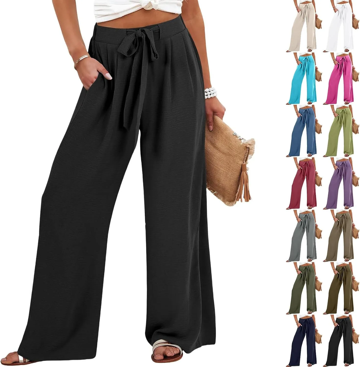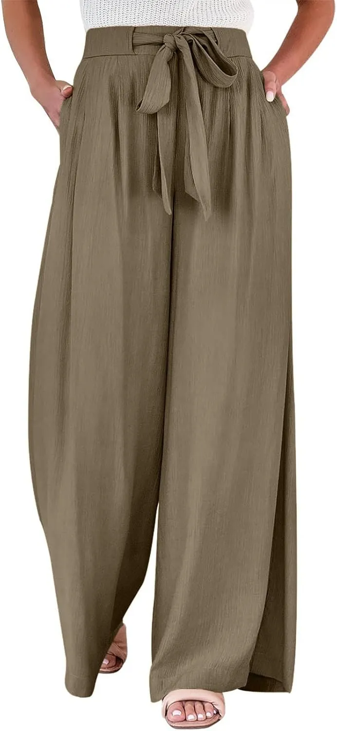 Palazzo Pants for Women Casual Dressy Tie High Waisted Wide Leg Linen Pants Baggy Flowy Boho Beach Pants with Pockets