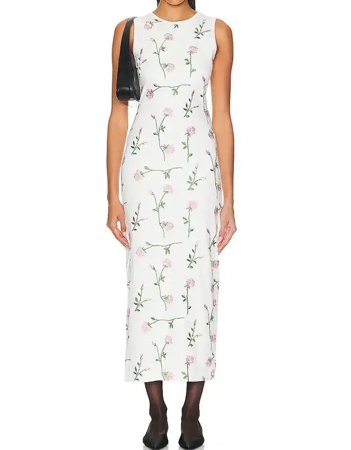 Whether you're strolling through a flower market or enjoying a sunset dinner by the sea, the Pink Rose Sleeveless Knit Cotton White Dress ensures you do so in style. Its timeless design and romantic detailing make it a must-have for your summer wardrobe, offering endless possibilities for creating effortlessly chic outfits. Embrace the season with the Pink Rose Sleeveless Knit Cotton White Dress and let your inner romantic shine.