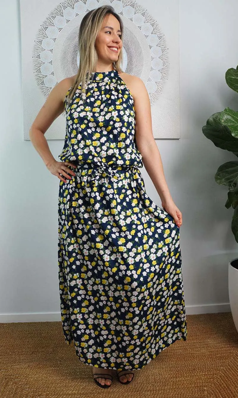 The Long Chloe Dress features a high halter neck design, elastic drawstring tie waist which allows this rayon maxi to fall beautifully on any body shape.