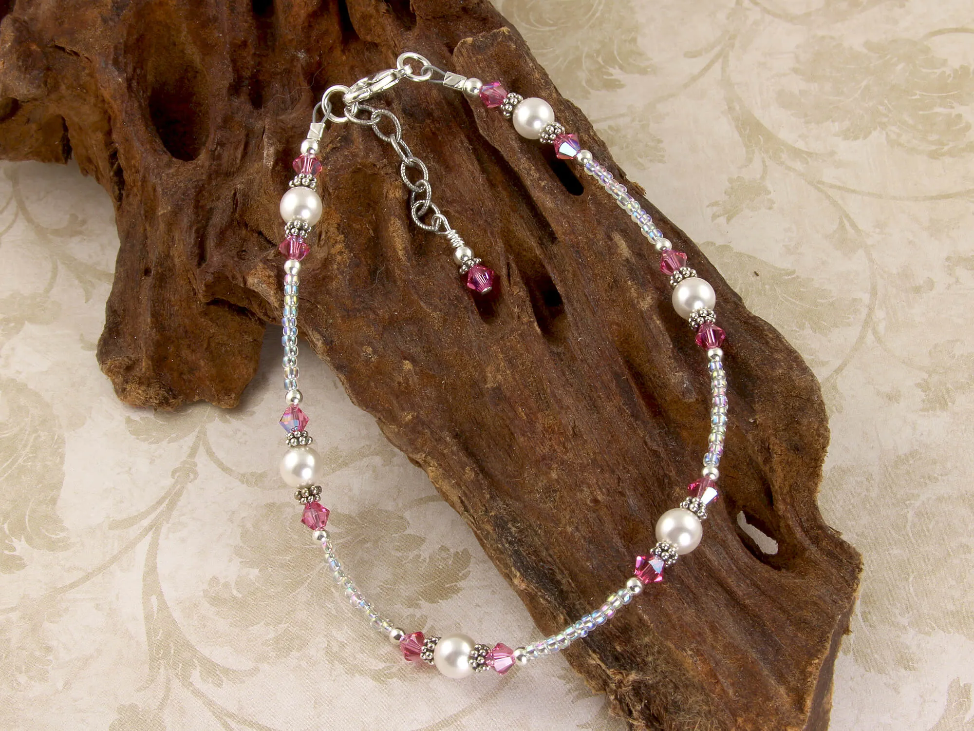 Stunning, handmade, adjustable inch pink pearl beaded anklet created with clear rainbow seed beads, rose Swarovski Austrian crystals, cream rose Swarovski crystal-based pearls, Bali .925 silver, and sterling silver.