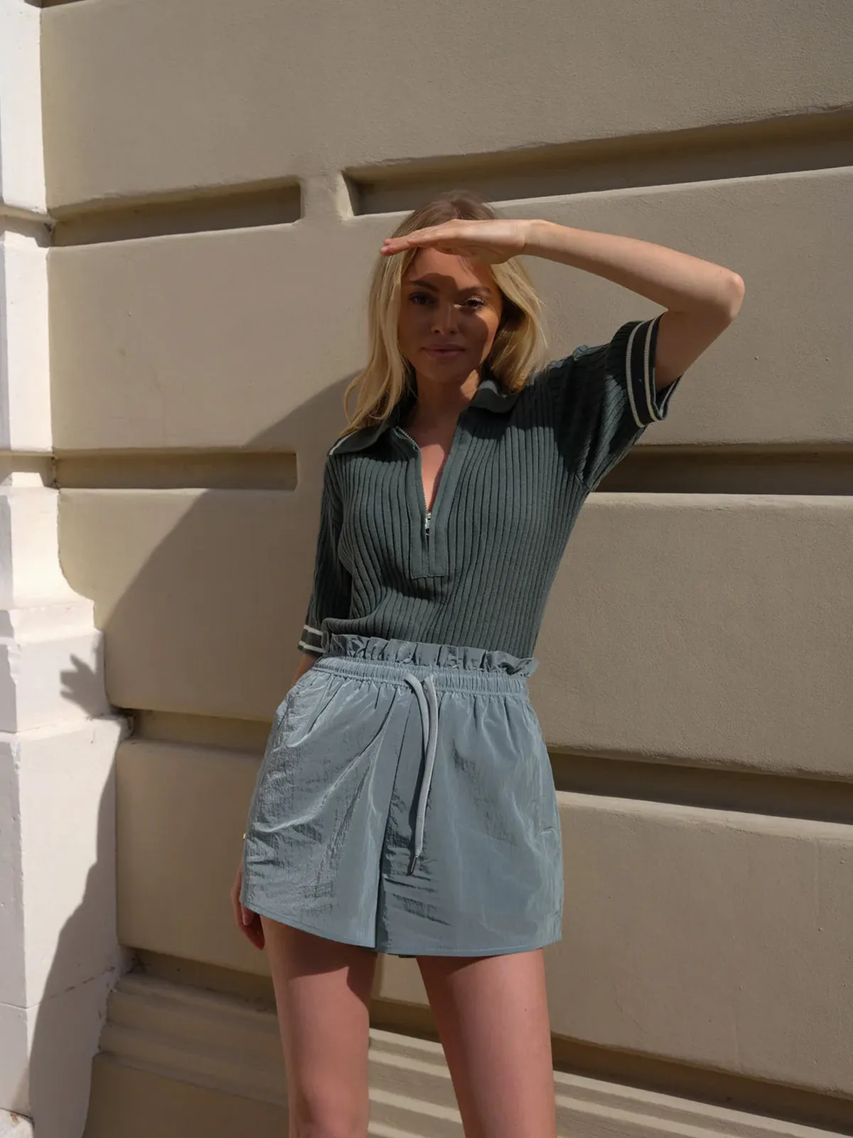 Summer shorts have been given an elevated new look with Varley's new Shimmer Shell fabric. These high waisted beauties feature a paperbag waist with drawcord, pockets and a stunning sage green colour. The lightweight shimmery fabric is cut to a flattering A-line silhouette for a sophisticated look