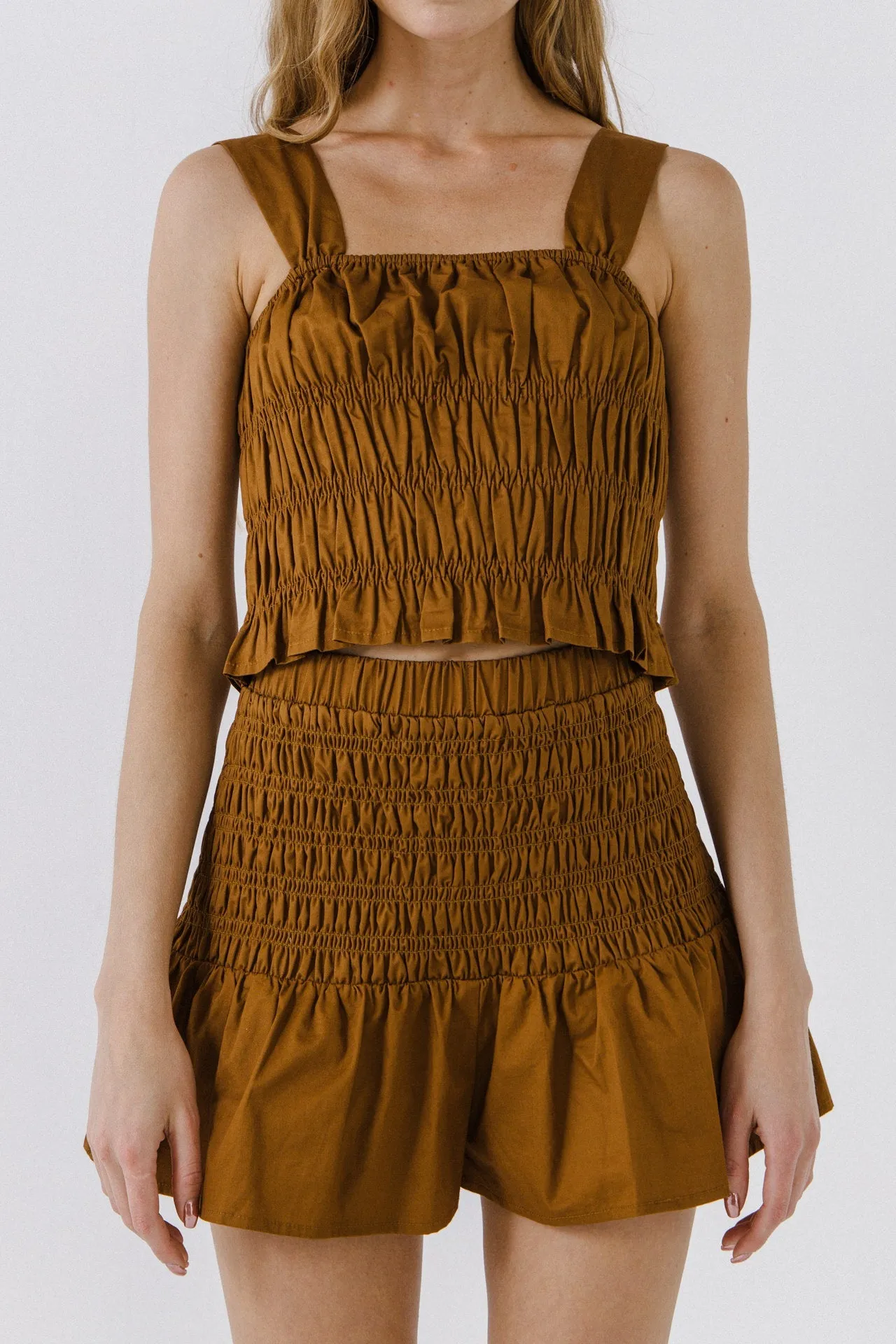 Try this stylish Smocked Ruffle Top for the perfect smart-casual look. It features smocked detail and a flattering cropped length, plus delicate ruffle details for a feminine touch. The sleeveless style makes it ideal for sunny days and the lightweight material makes it an easy piece to throw on. Our Smocked Ruffle Top is sure to become a wardrobe favorite this season.