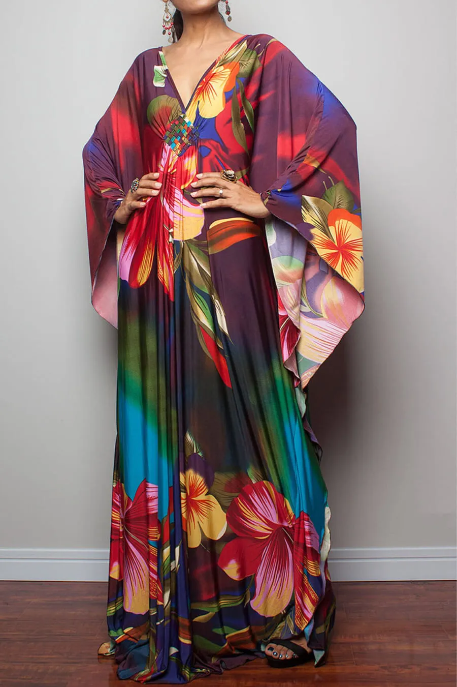 Discover the ultimate in beach elegance with our Women's Rainbow pattern kaftan dress. Perfect for plus-size figures, this batwing long sleeve kaftan maxi dress offers a vibrant cover-up option, blending comfort and style for your summer adventures.