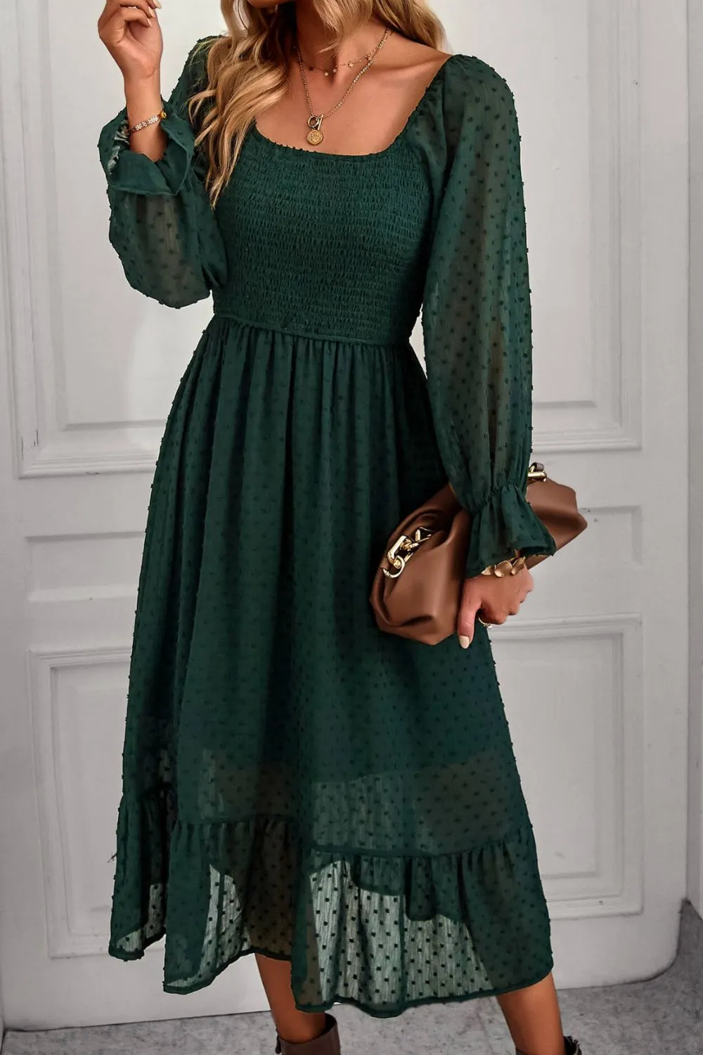 The Swiss Dot Smocked Ruffle Hem Flounce Sleeve Dress is a dramatic dress that will make you feel like a princess. The smocked design adds a fun, playful element to the dress, while the flounce sleeves give it an elegant flair.