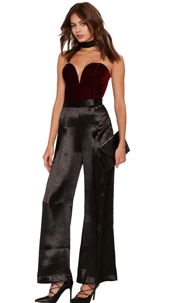 Red velvet strapless bodysuit with a sweetheart neckline and deep v plunge, open back with criss cross lace up details and a thong bottom that snaps closed.