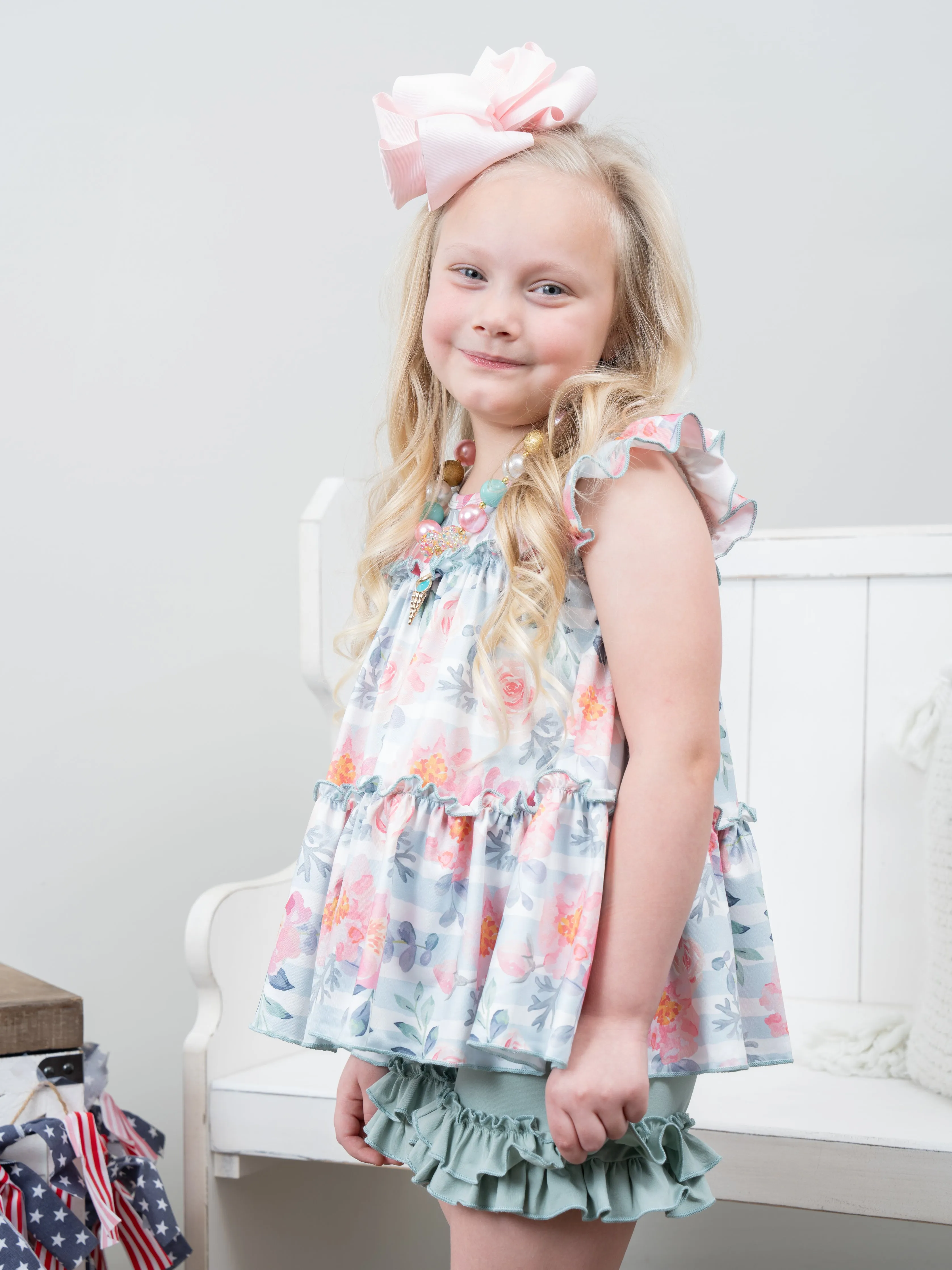 These are perfect for spring & summer fun! This tiered tunic features a stunning pink rose design, ruffles, flutter sleeves, & a keyhole at the nape of the neck for easy changing.